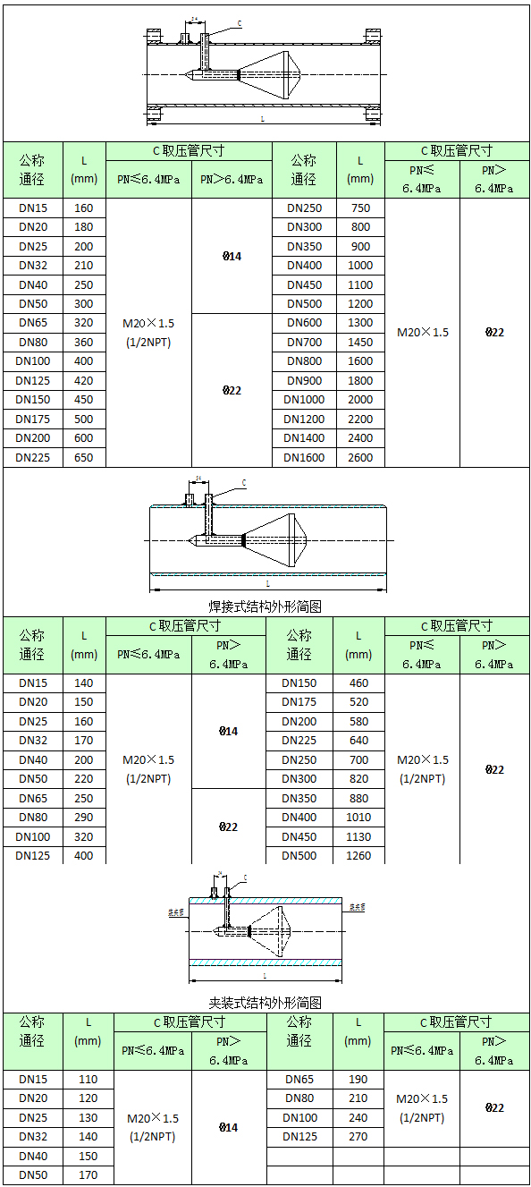 ▲ 法兰式、焊接式、夹装式、的连接形式与尺寸