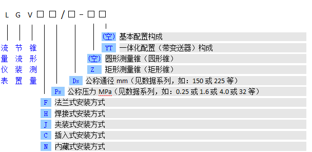 例2“LGVH4.0/500×800-ZYT”为:焊接式压力4.0 MPa通经500×800mm的矩形一体化配置内锥流量计