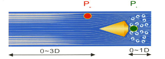 ▲ 具有较明显的自整流效果,对管道布局要求低:当流体流经圆锥体时,沿着锥体形成一个平稳的边界层,一般节流件前1-3D、后2D的直管段,即可保证测量精度的要求。