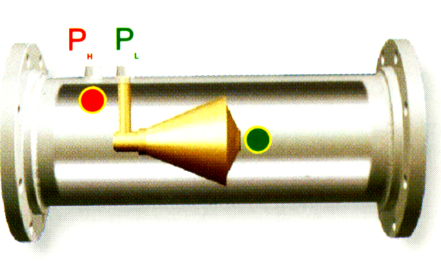 充满管道的流体流经与管道同轴的锥体时,流束将逐渐地收缩到管道内边壁附近,从而使流速增加,静压力降低,于是在锥体的前后产生了差压△P,流速V愈大,差压△P也愈大,所以通过测量差压的大小来测量流经管道流量的大小。